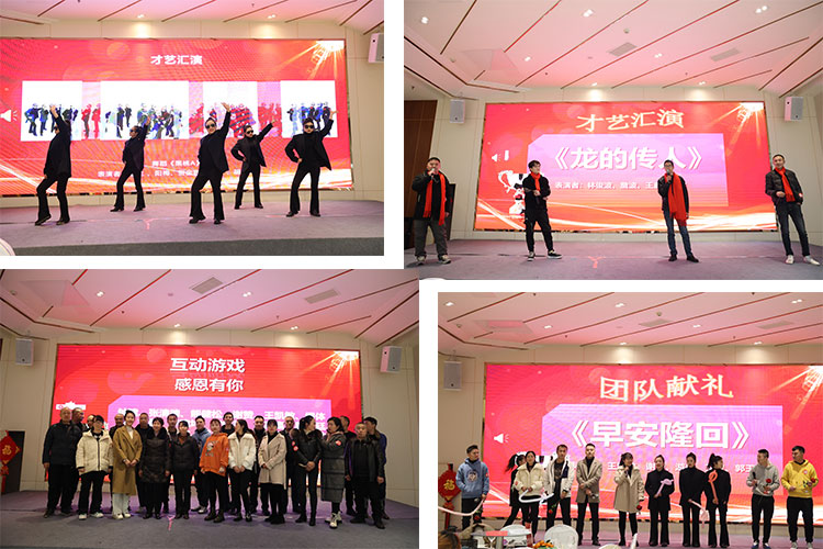 每个人的心中都有一个舞台,年会现场歌舞萦绕,大家激情澎湃,精彩节目轮番上演,欢呼声鼓掌声此起彼伏。由各部门员工动情演绎的经典曲目《龙的传人》、《万疆》、《早安隆回》,激起了大家的青春回忆,让人忍不住大喊:想再听亿遍;舞蹈《黑桃A》、《即兴舞蹈》更是把现场氛围推向高潮;游戏环节《有奖问答》 、《幸运抽奖》、《感恩有你》、《蒙眼互打》、《成语接龙》、《七拼八凑》点燃了现场热闹氛围,你来我往的互动让大家更加连接彼此,更具凝聚力。